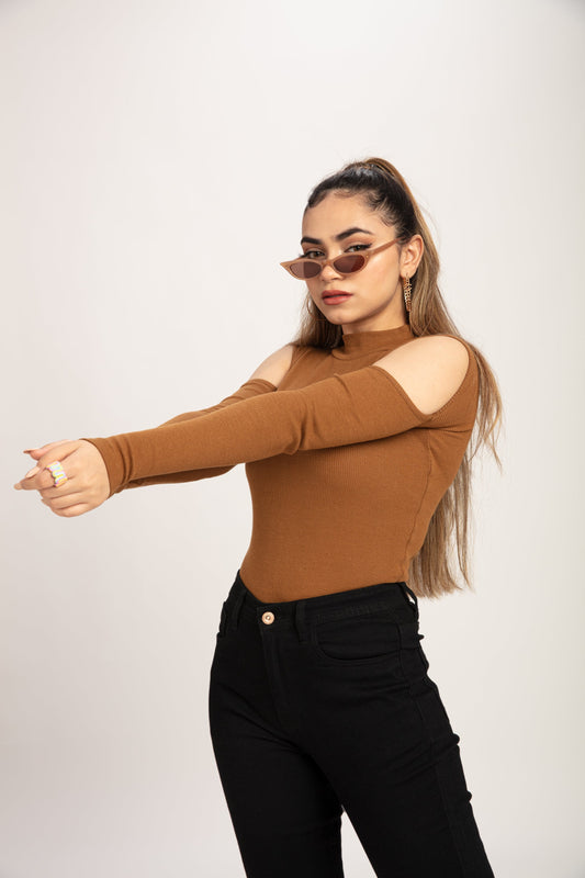 Teddy Brown Cold Shoulder Mock Neck Top