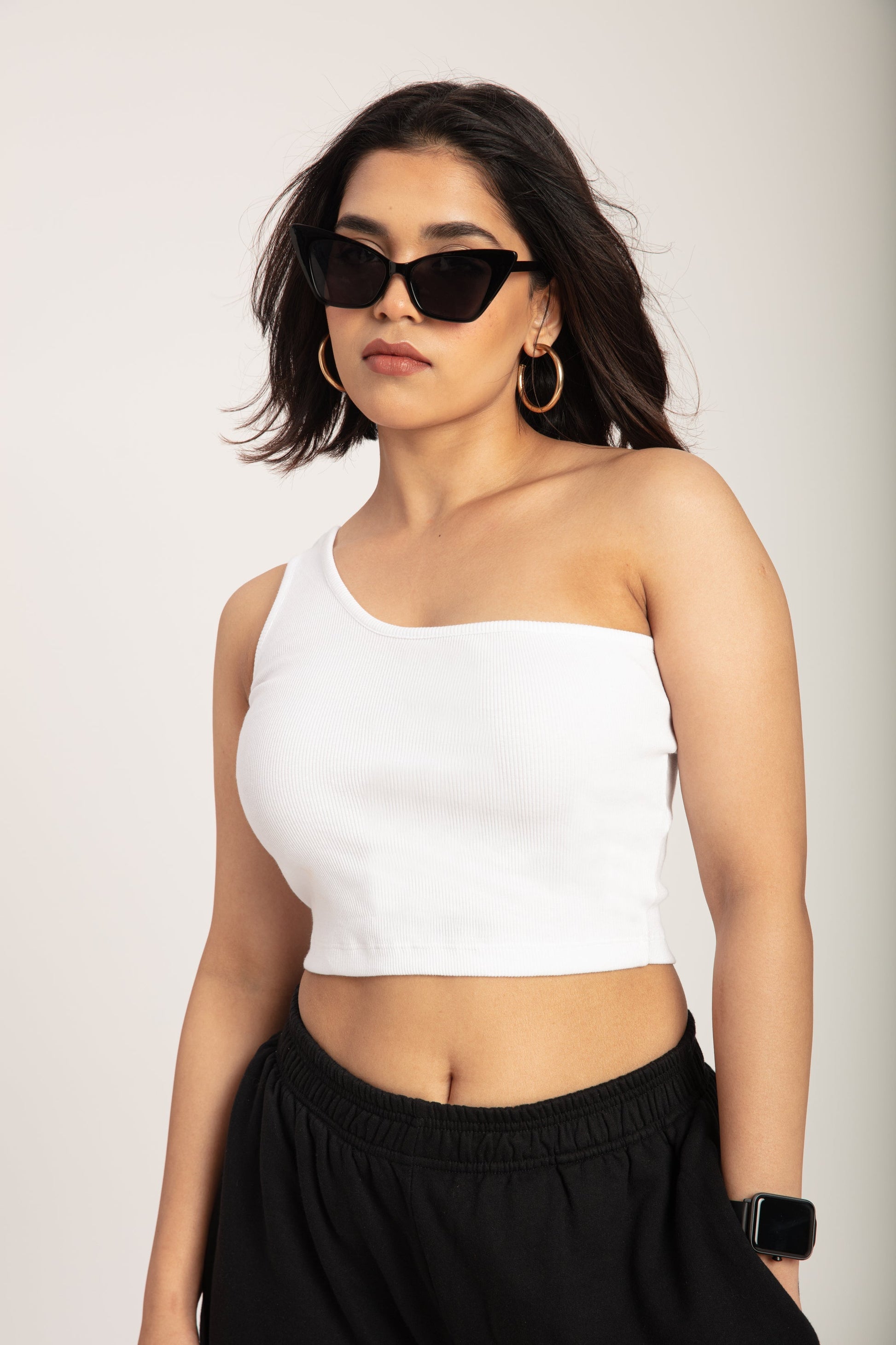 Simple and Stylish, this One shouldered crop top is cut from the soft, smooth and high stretch-ability rib knit fabric.