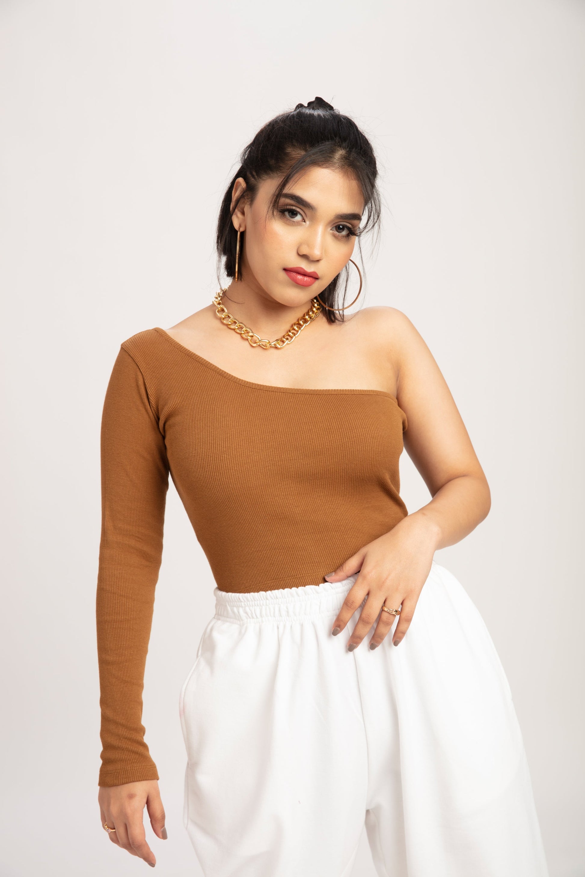 This top has a flattering asymmetrical neckline and one shoulder full sleeve of rib knit fabric having high comfort and stretch-ability.