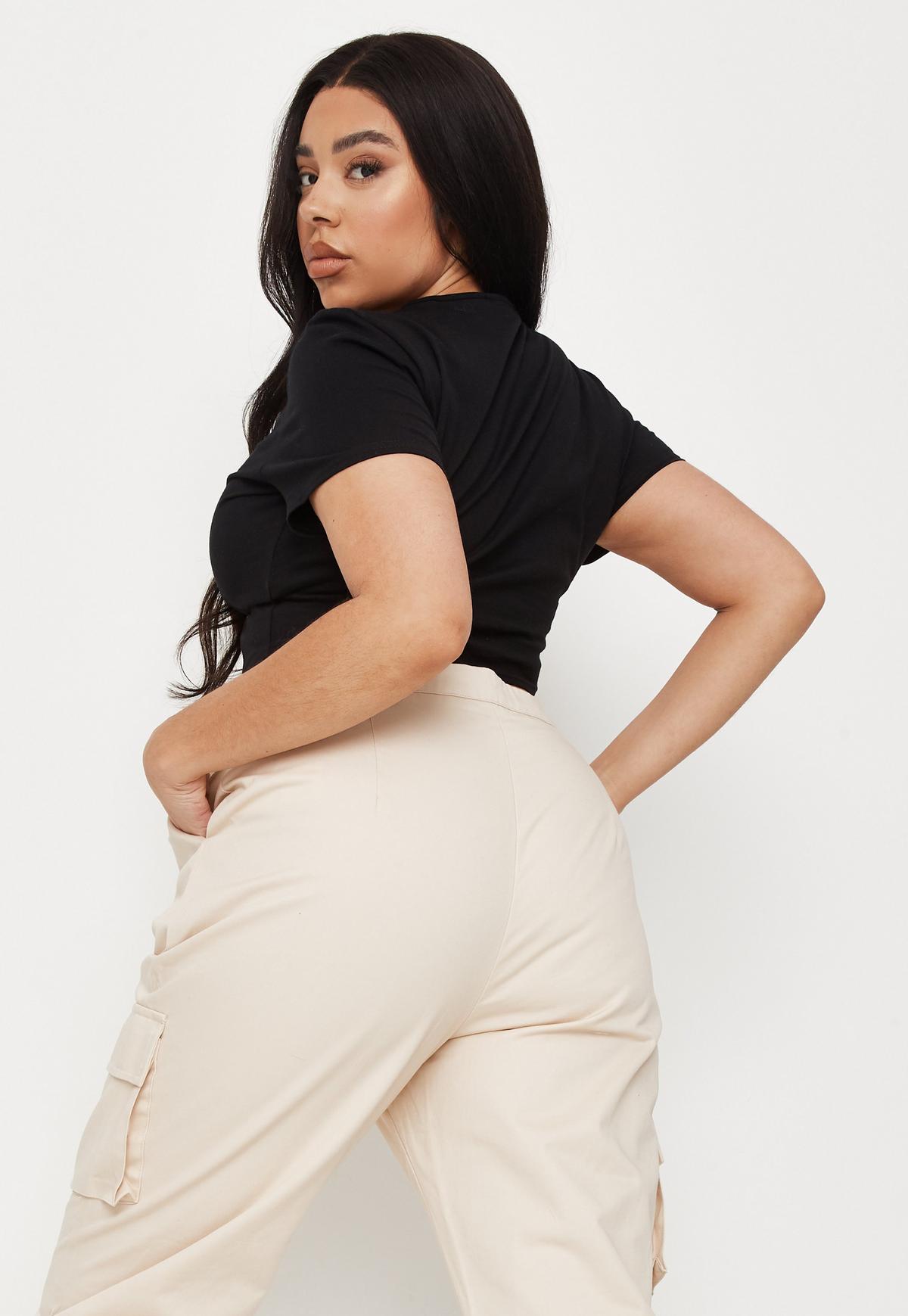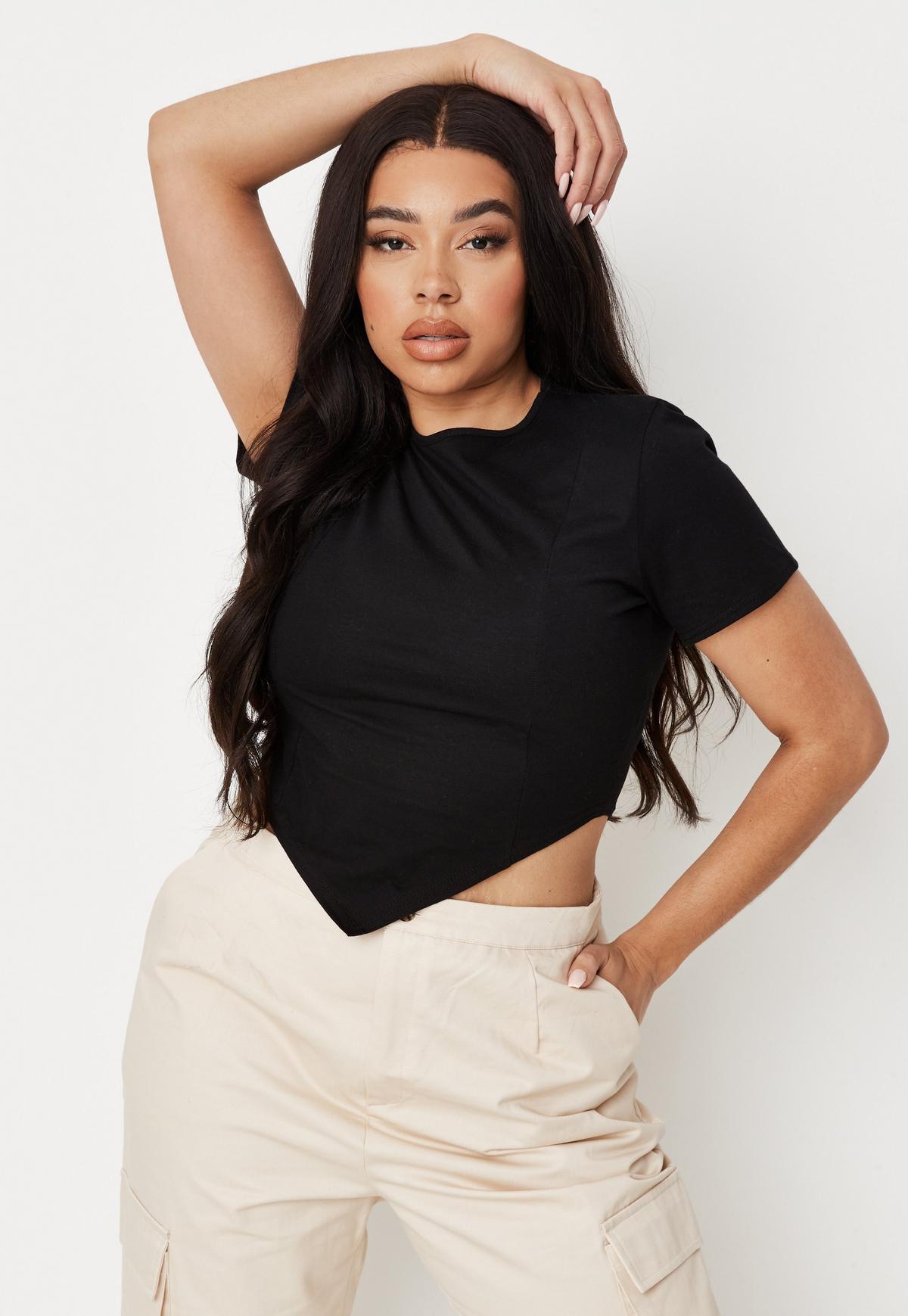 This tee is designed for a relaxed yet stylish fit with short sleeve crop top featuring V front hem.