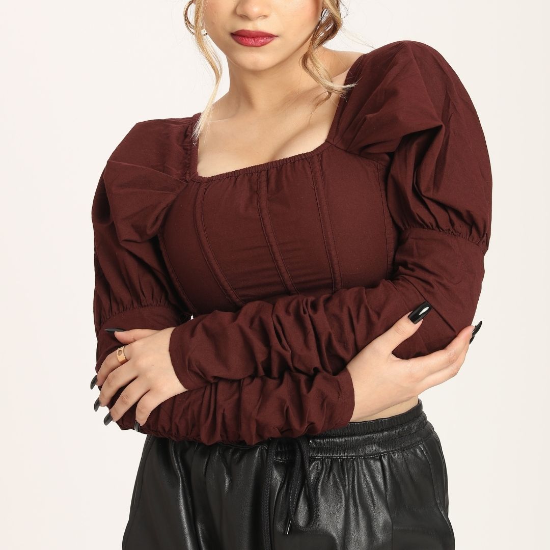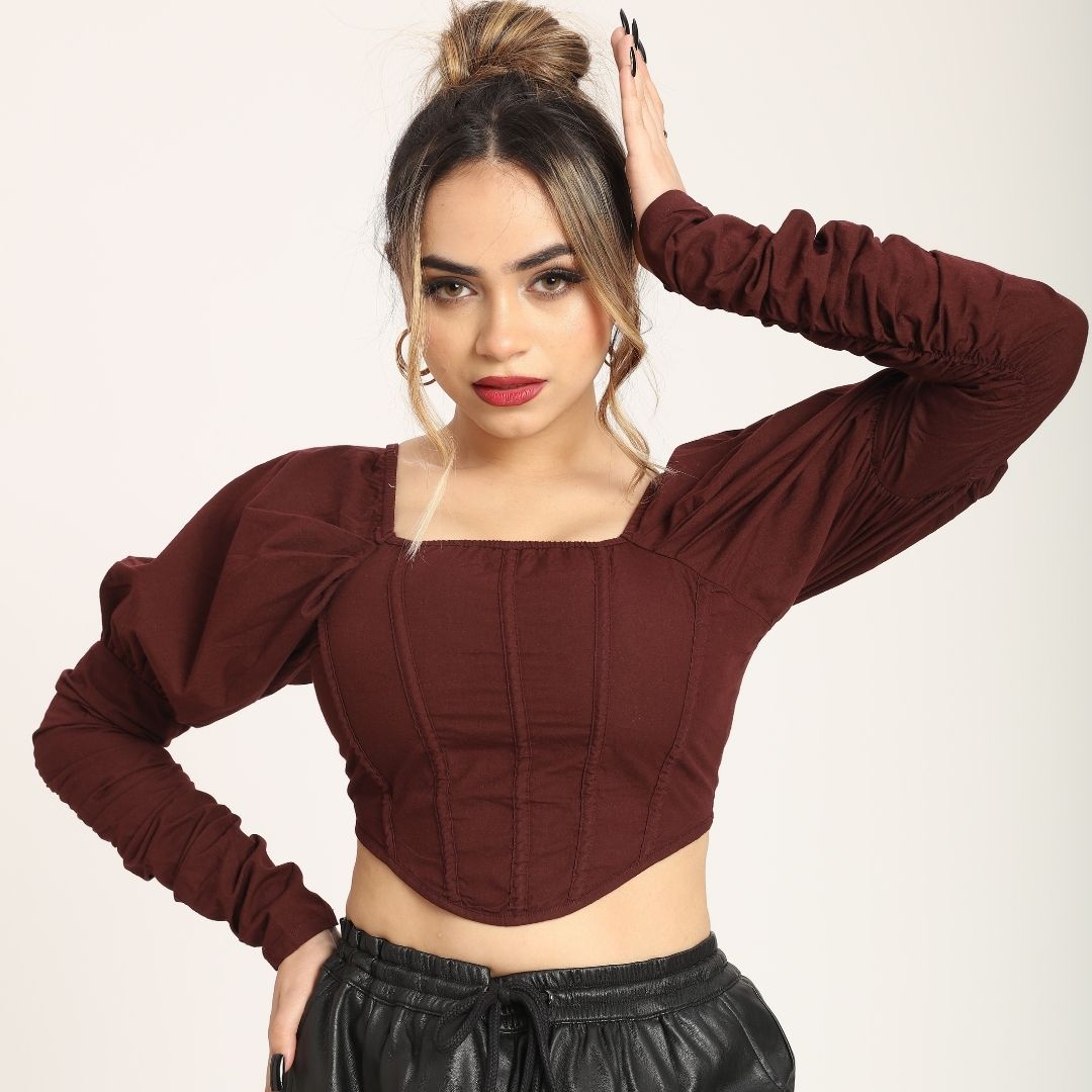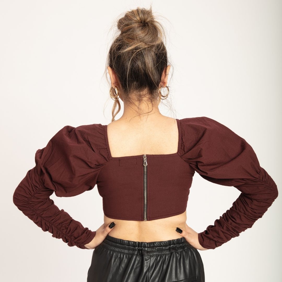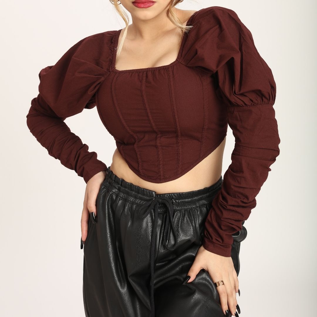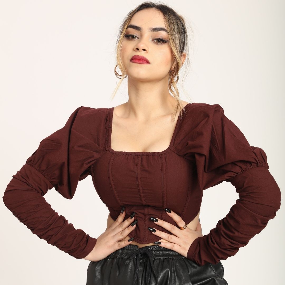 Give your look a chic finish with this corset. Featuring a brown Poplin material with puff sleeves, a cropped length and a zip fastening. Perfect Fit at the Waist.