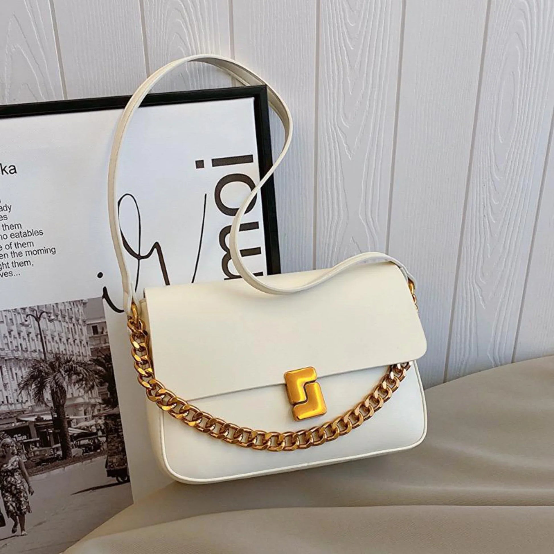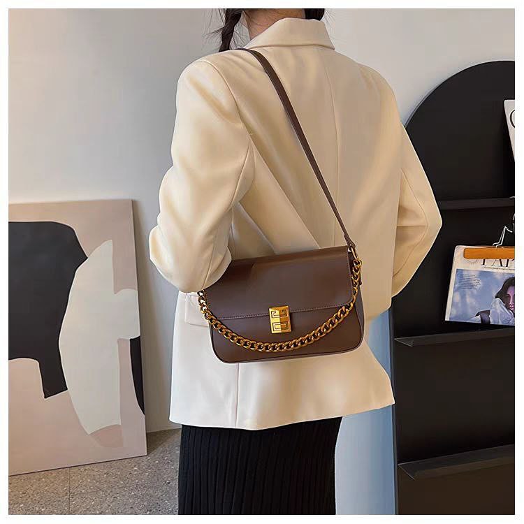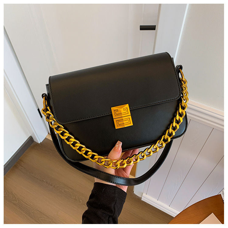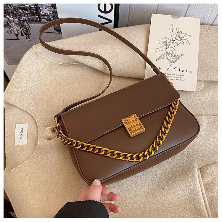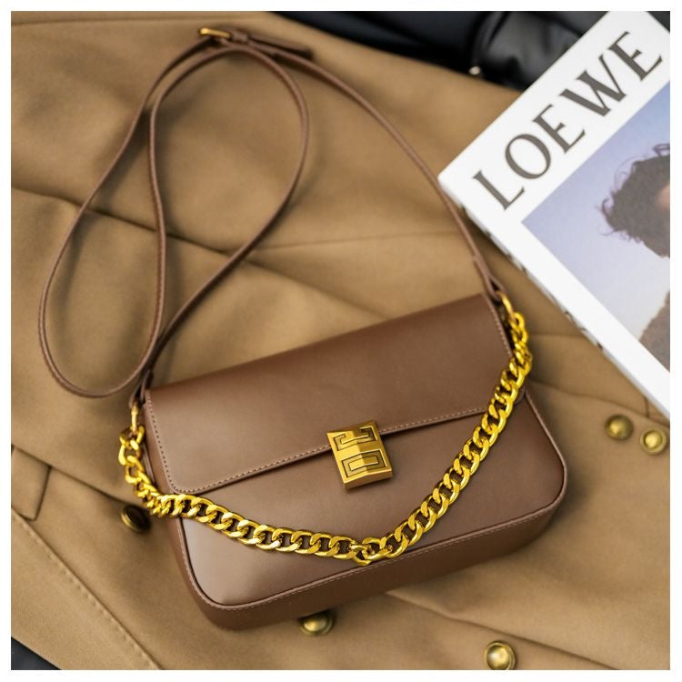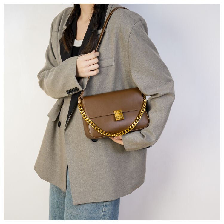 Elevate your style with the Classic Metal Buckle Shoulder Bag, a sophisticated accessory featuring luxurious PU leather with gold buckle and chain details.