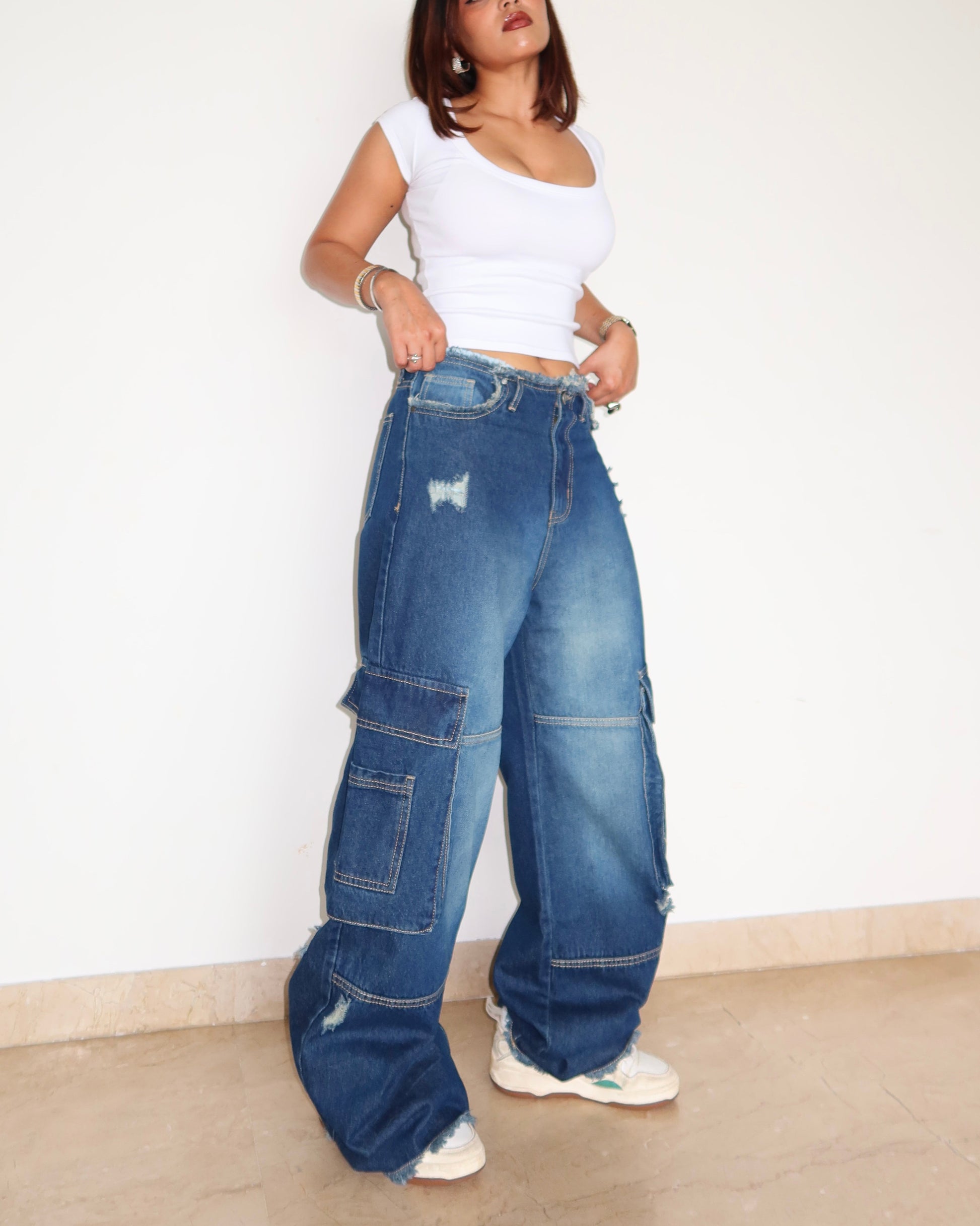 Details: Frayed waistband, raw-cut hem, distressed patches, oversized cargo pockets on both legs