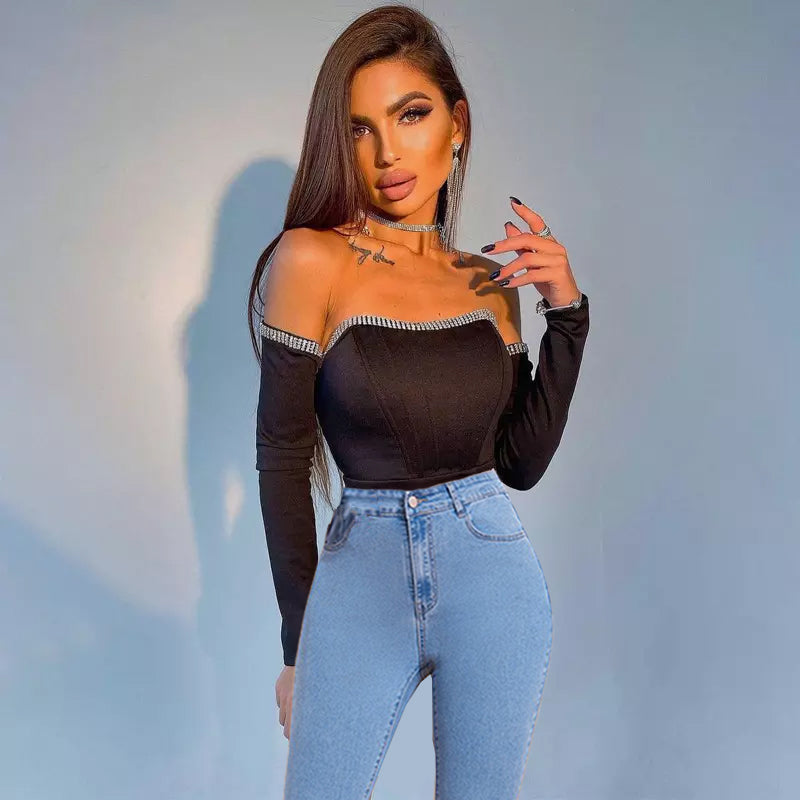 They say Diamonds are girls best friend, Exactly why you need to have this beautiful top in your wardrobe. Featuring our very new off shoulder rhinestone detail crop top along with full sleeves.