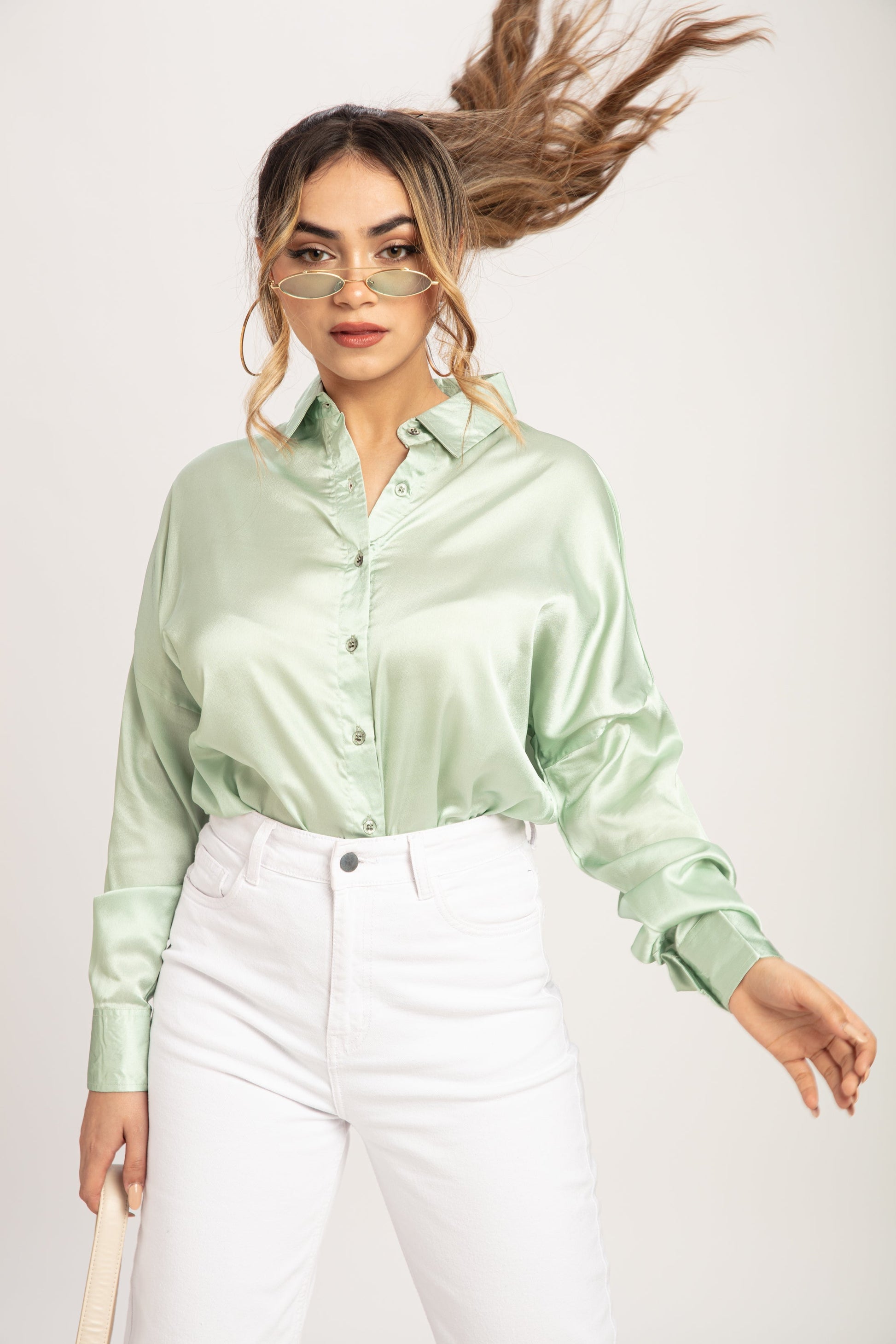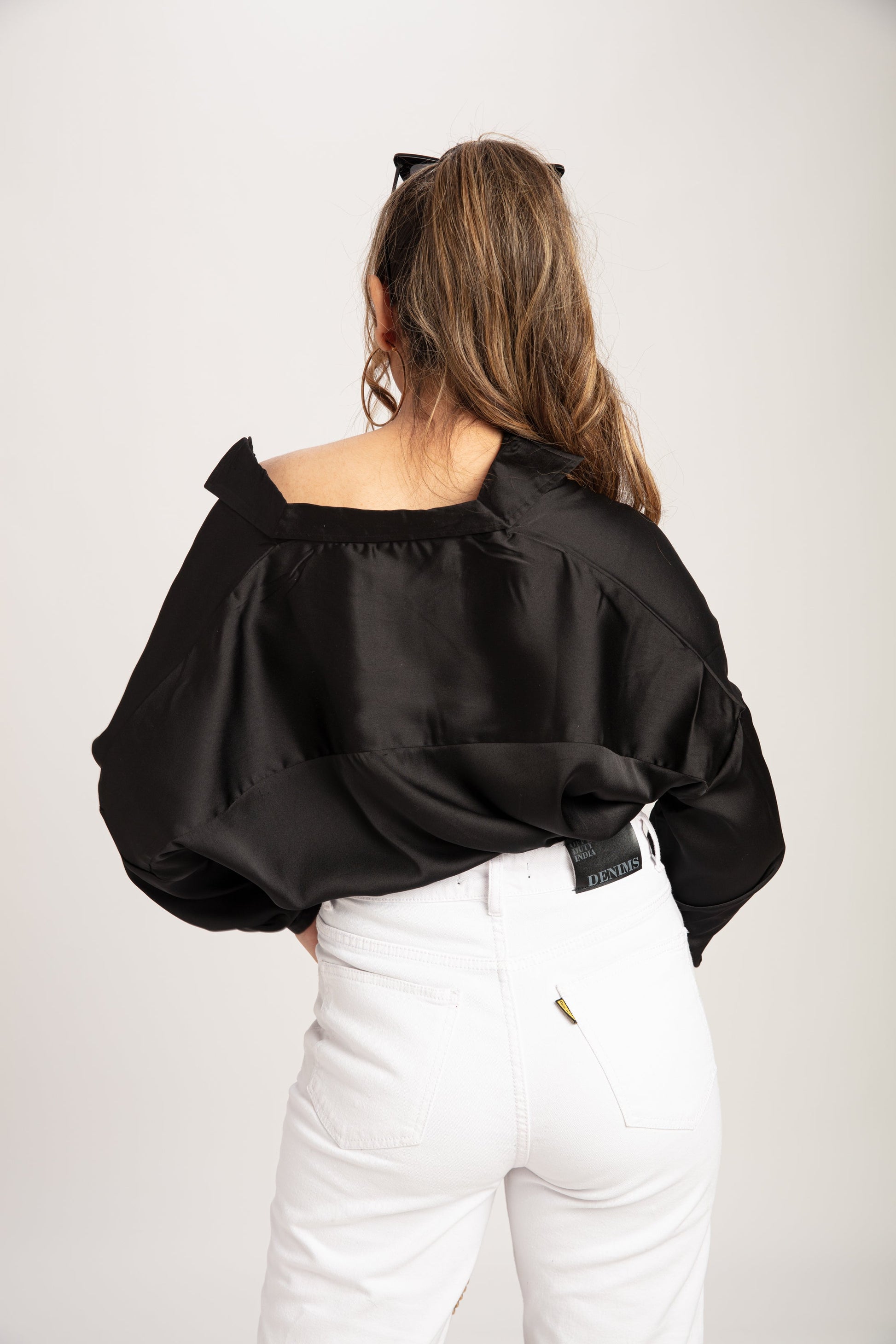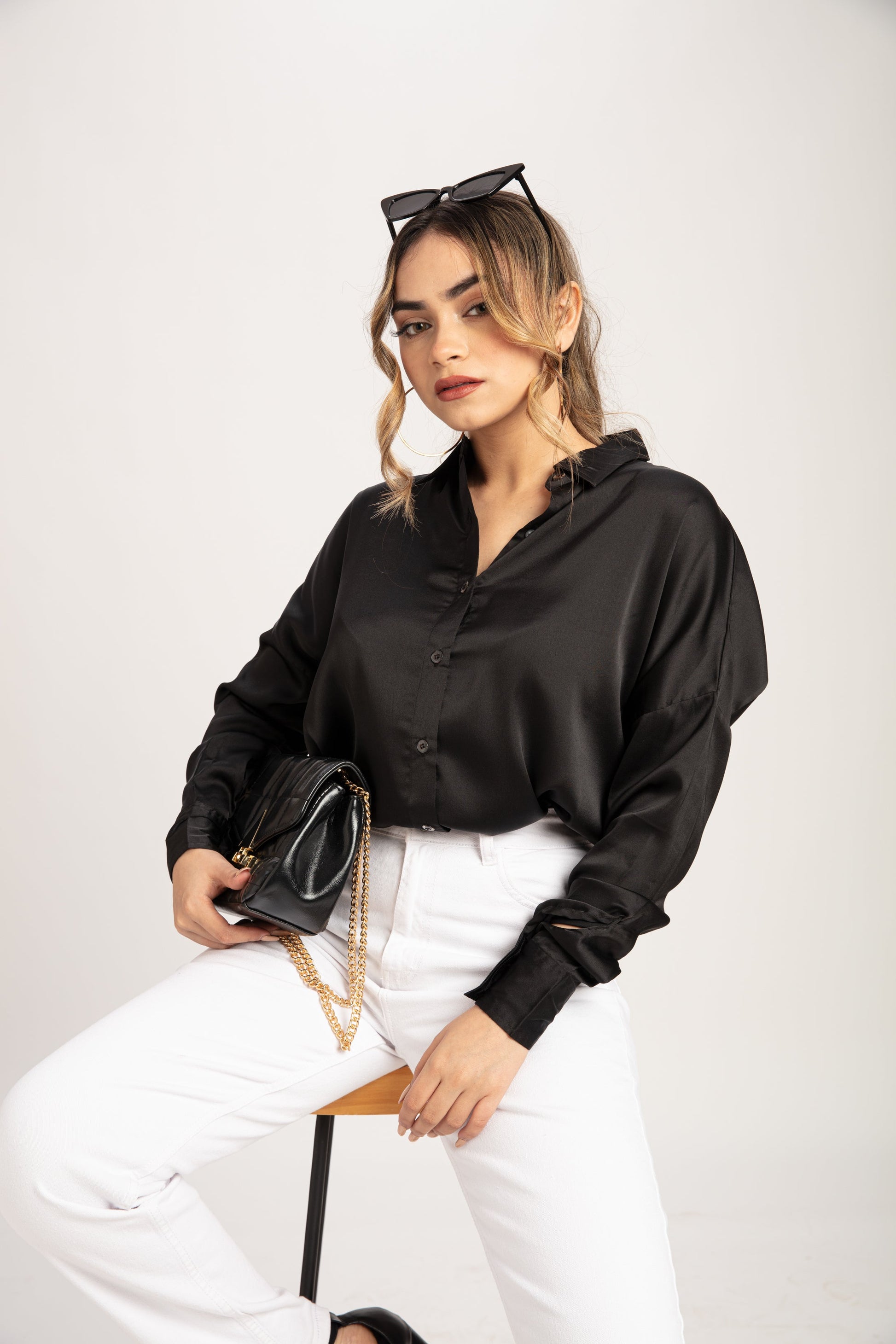We are obsessing over all things satin right now and this shirt is at the top of our hit-list. Featuring a soft black satin material with button front fastenings with a collar detail and drop shoulder style.