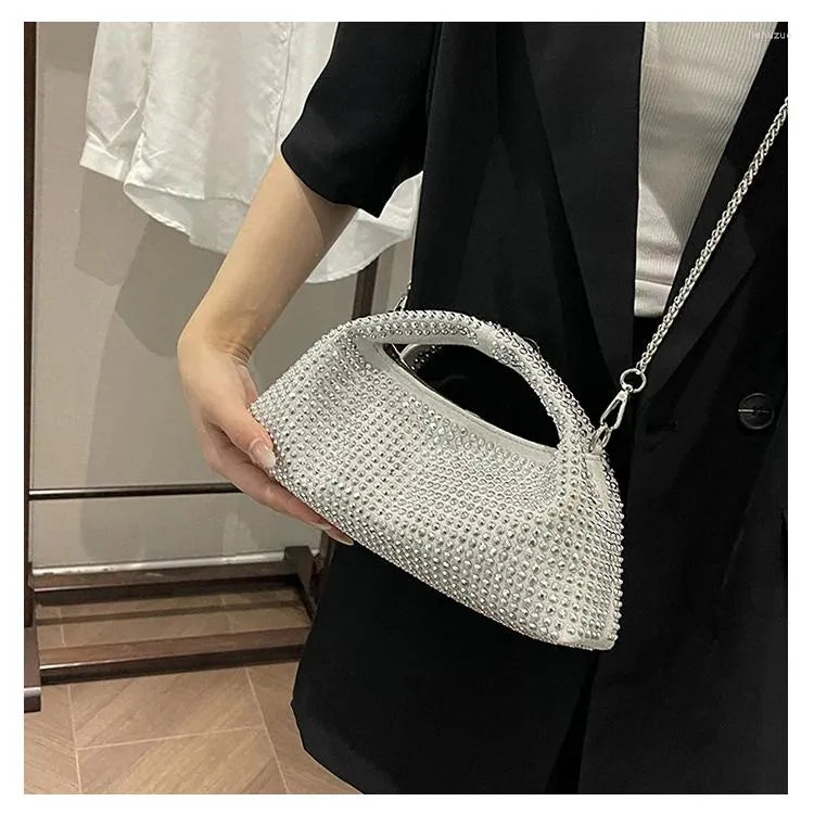 Shine through the night with the Evening Blinged Out Handbag, a trendy and versatile accessory designed to elevate any outfit with its dazzling silver rivet details.