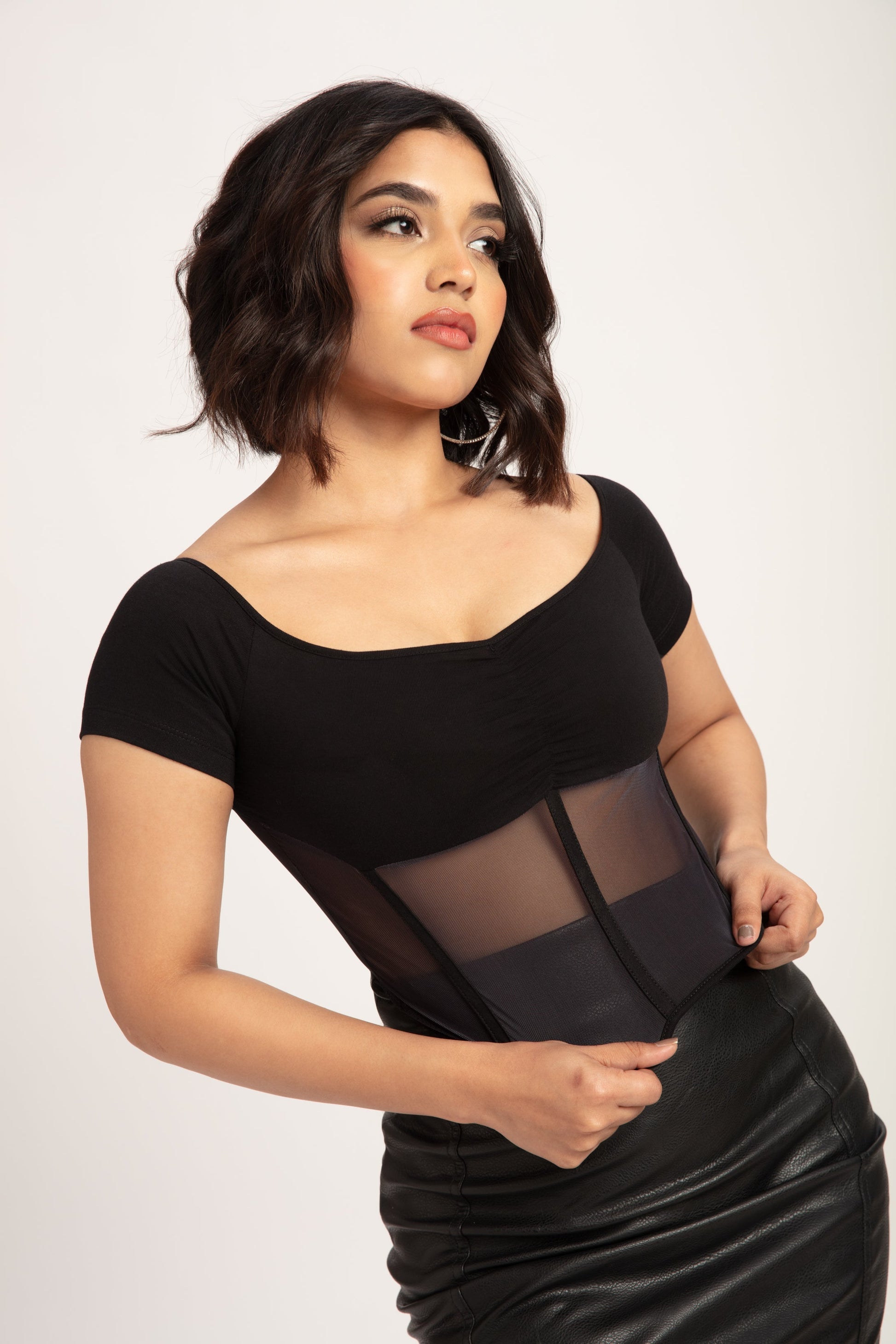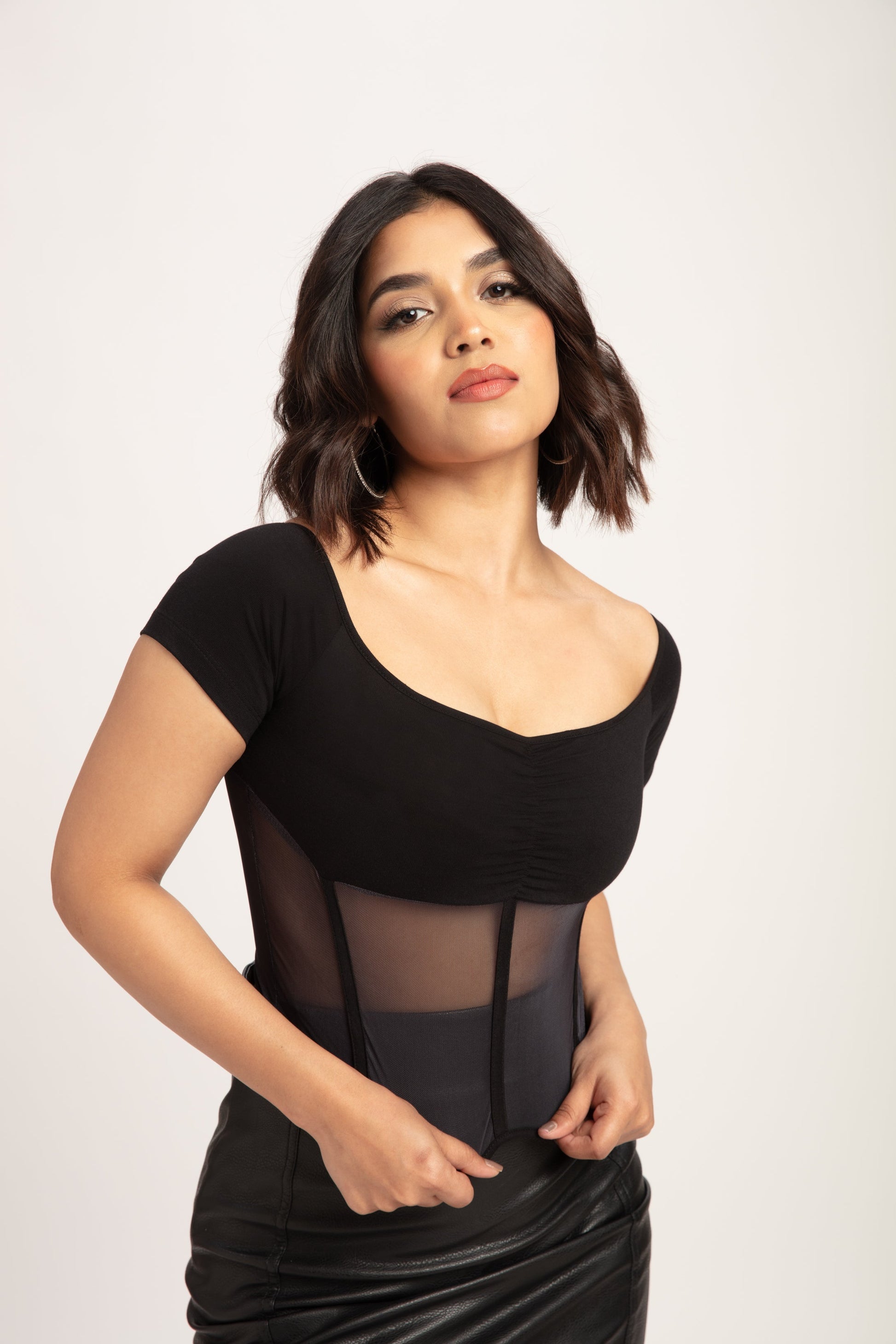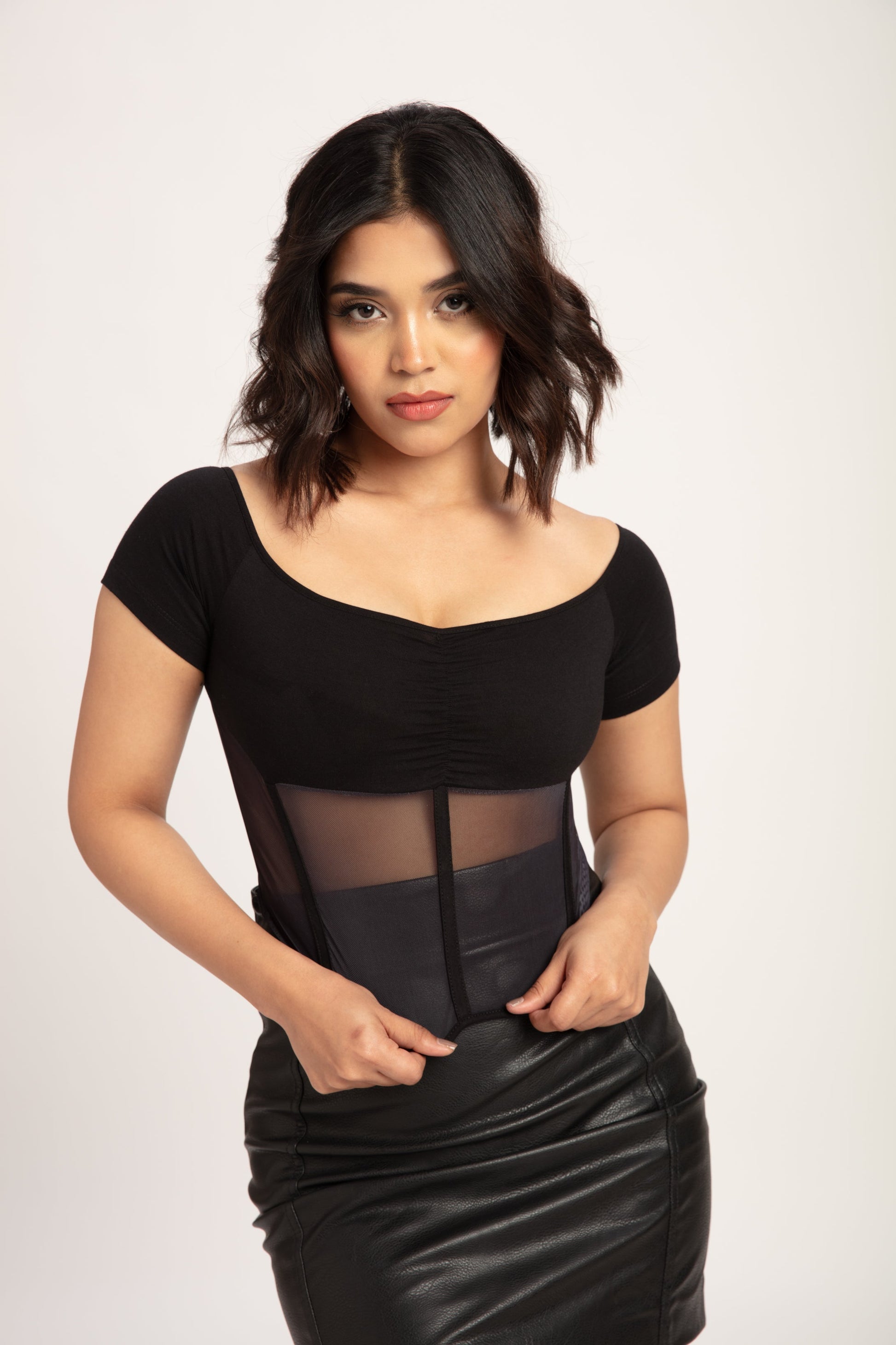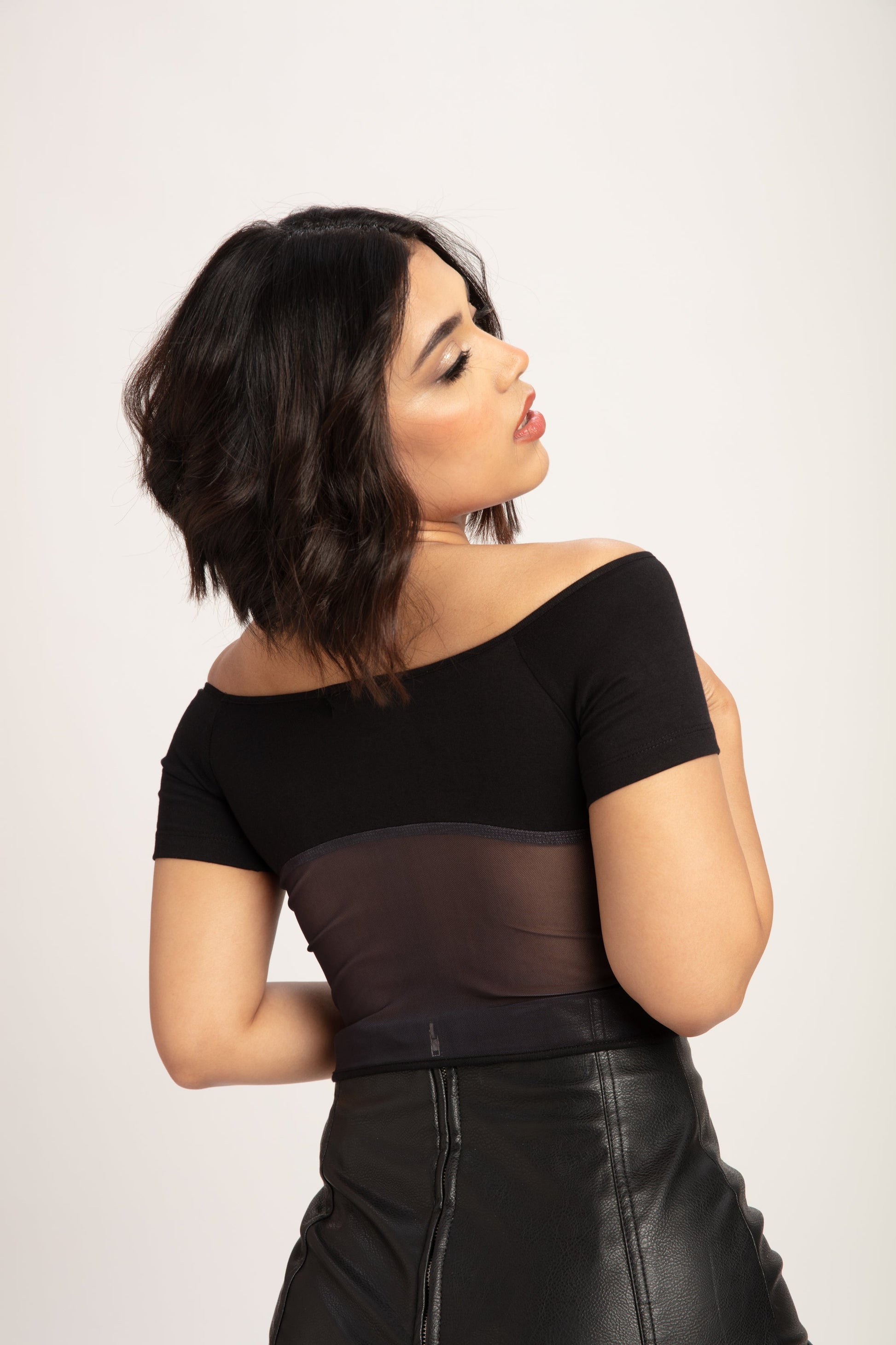 This crop top is sure to get you noticed this season. Featuring a black material with a off shoulder neckline and front ruched with mesh insert.
