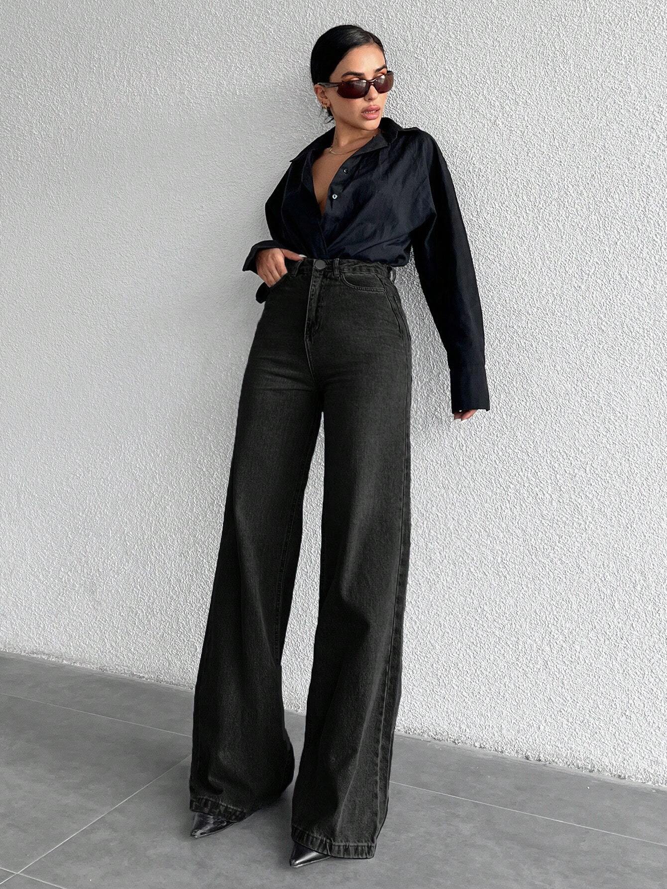 Onyx Black Stone Wash Wide Leg High Rise Jeans