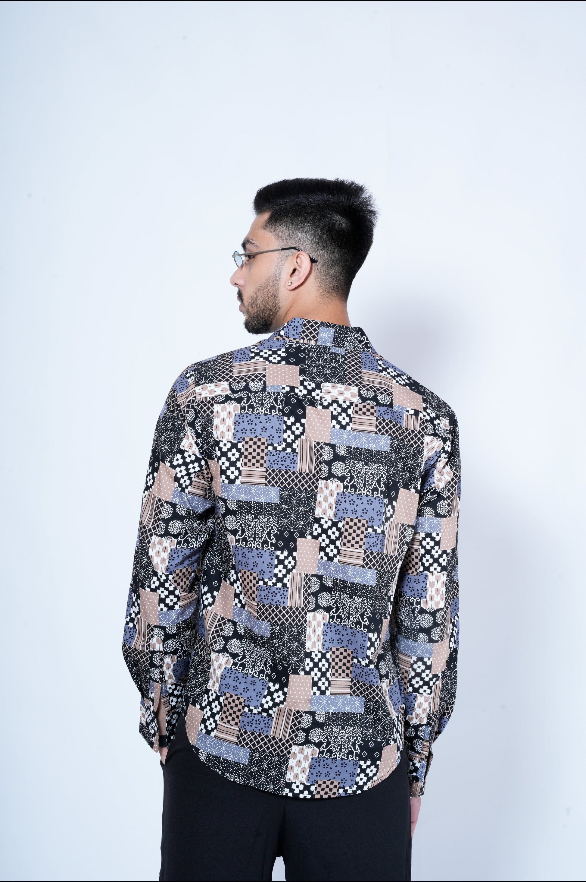 This shirt features a unique patchwork abstract design and full length sleeves, offering a stylish and sophisticated look. Made from high-quality materials, it provides comfort and durability. Elevate your wardrobe with this versatile and eye-catching shirt.