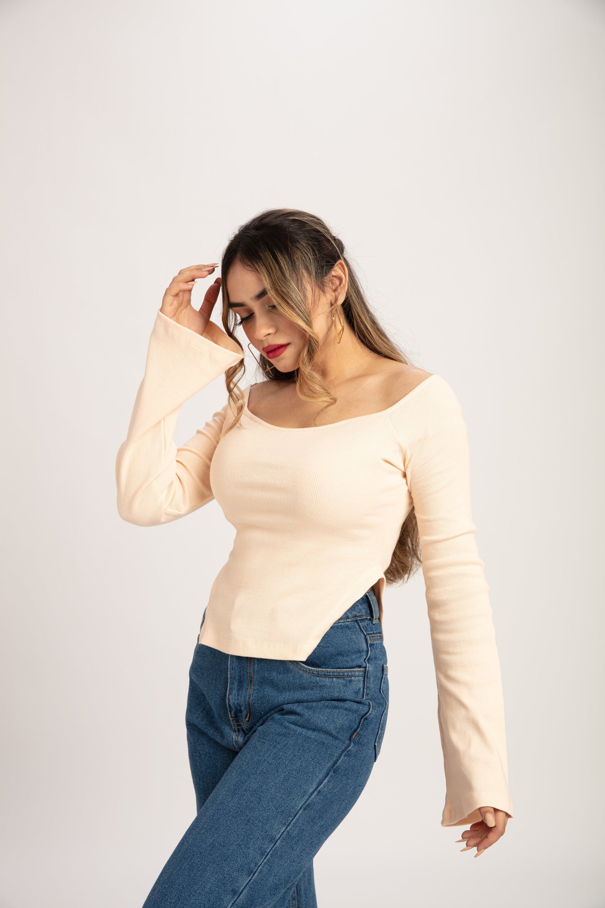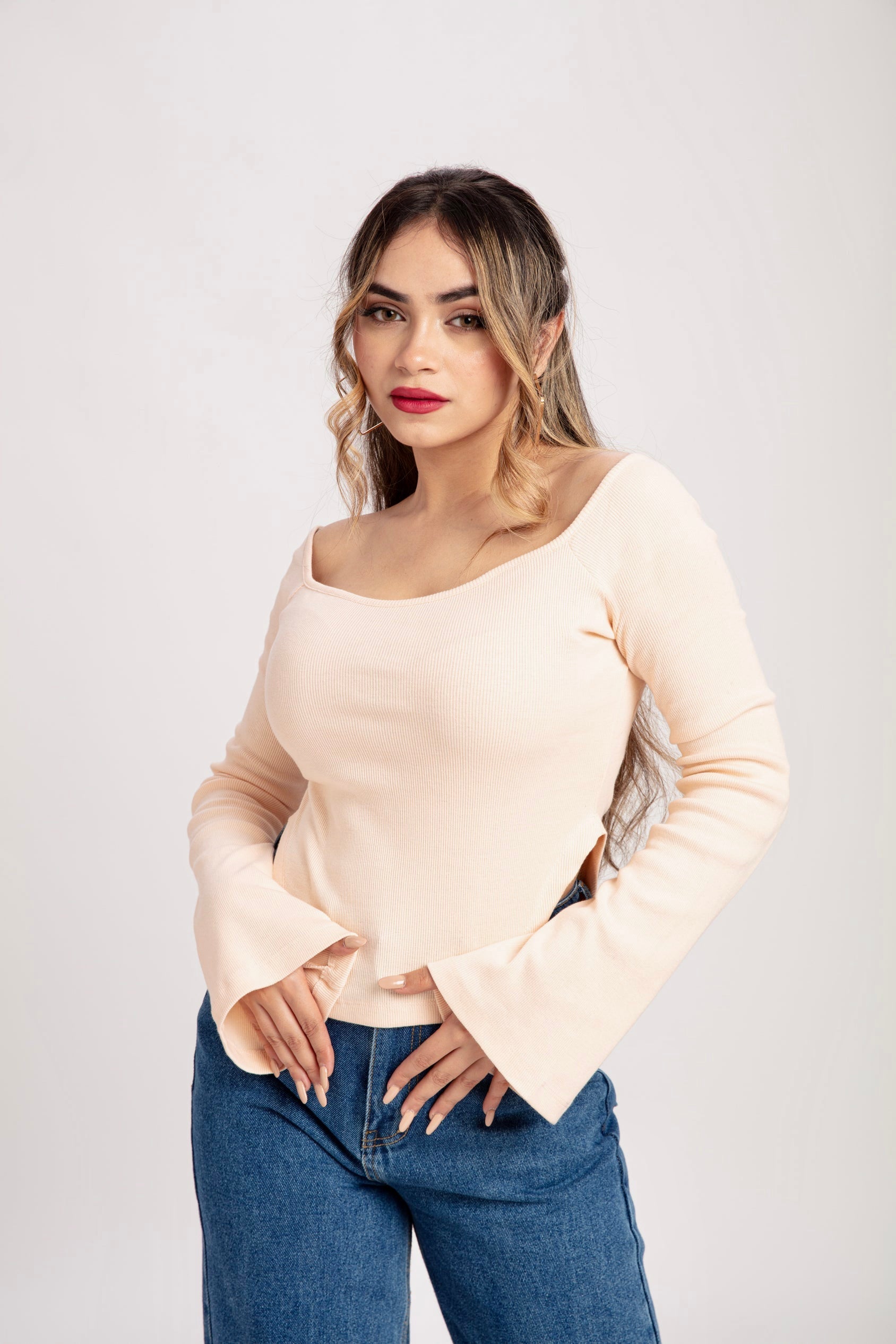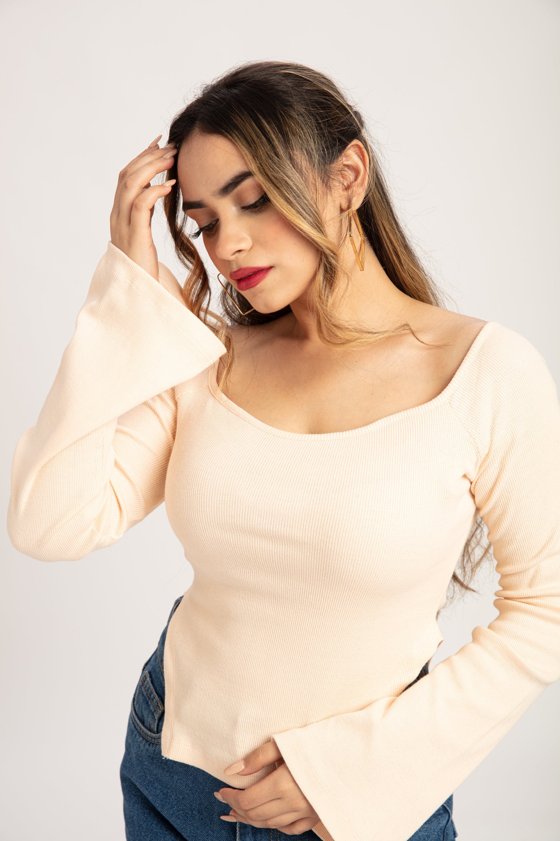 Peach asymmetric milkmaid top long flared sleeve milkmaid style top with an asymmetric hem in a rib fabric.