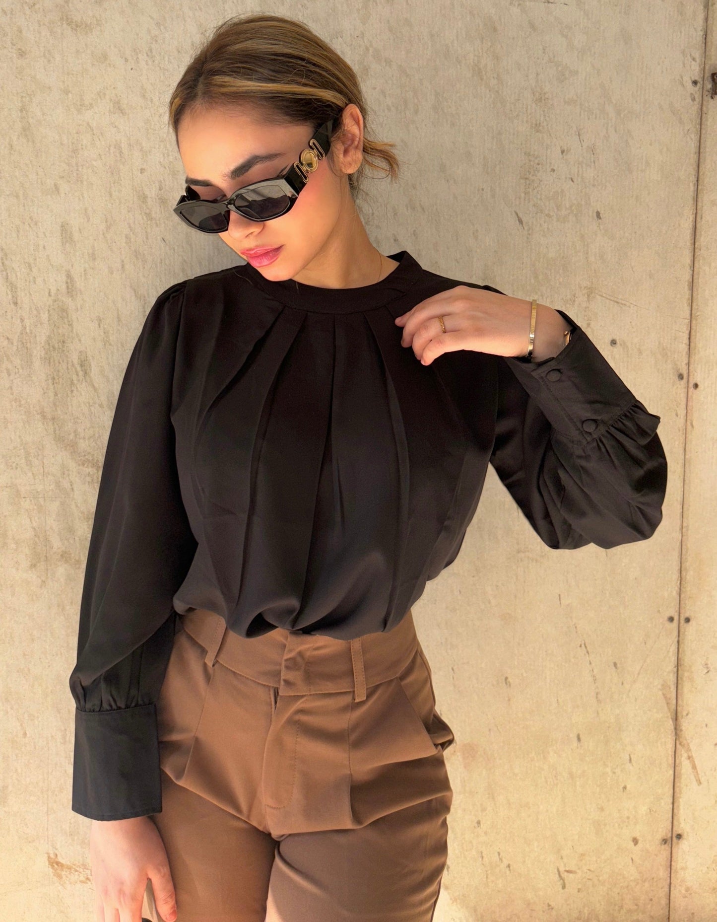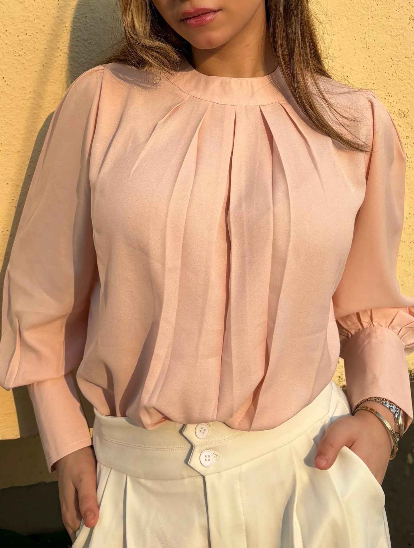 Pleated Neck Bishop Sleeve Blouse