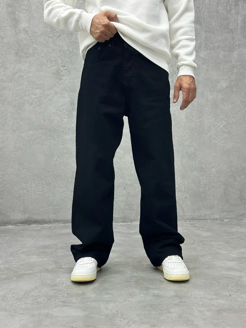 The Pure Black Baggy Fit Rigid Jeans redefine streetwear with their oversized silhouette and raw, rigid denim feel.