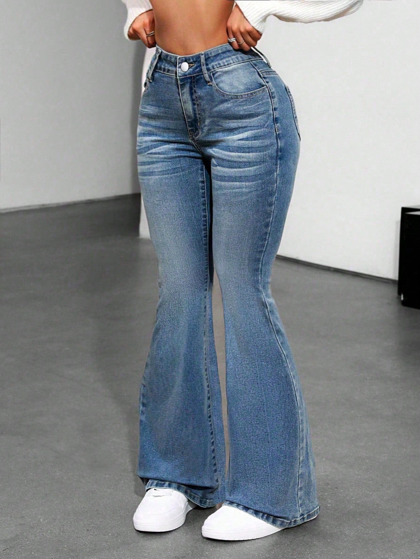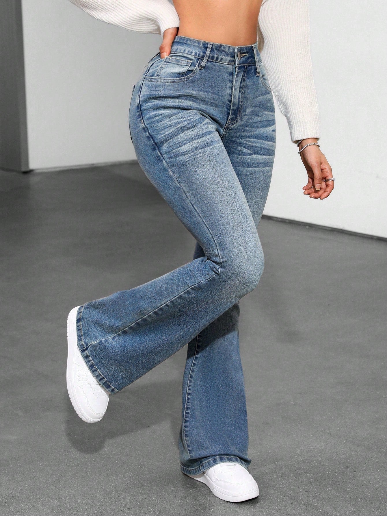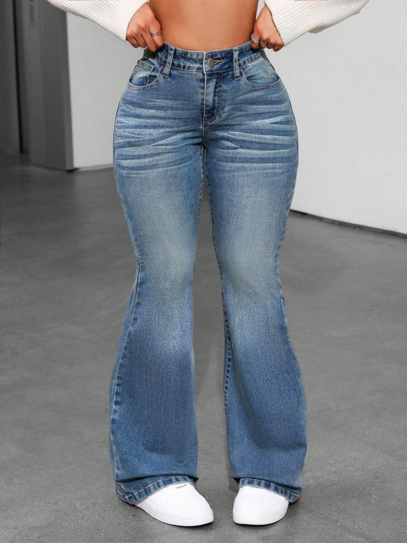 Bringing back vintage vibes with a modern fit, these high-rise flared jeans are made to elongate and flatter. The faded blue wash with subtle whiskering adds lived-in character, while the stretch denim ensures comfort and flexibility. Slim through the hips and thighs before flowing into a wide flare, they strike the perfect balance between retro-inspired cool and everyday wearability.