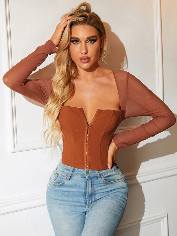 Cute white top with your favorite blue jeans never goes wrong. Featuring Off shoulder white mesh top with ruched full sleeves and corset style body.