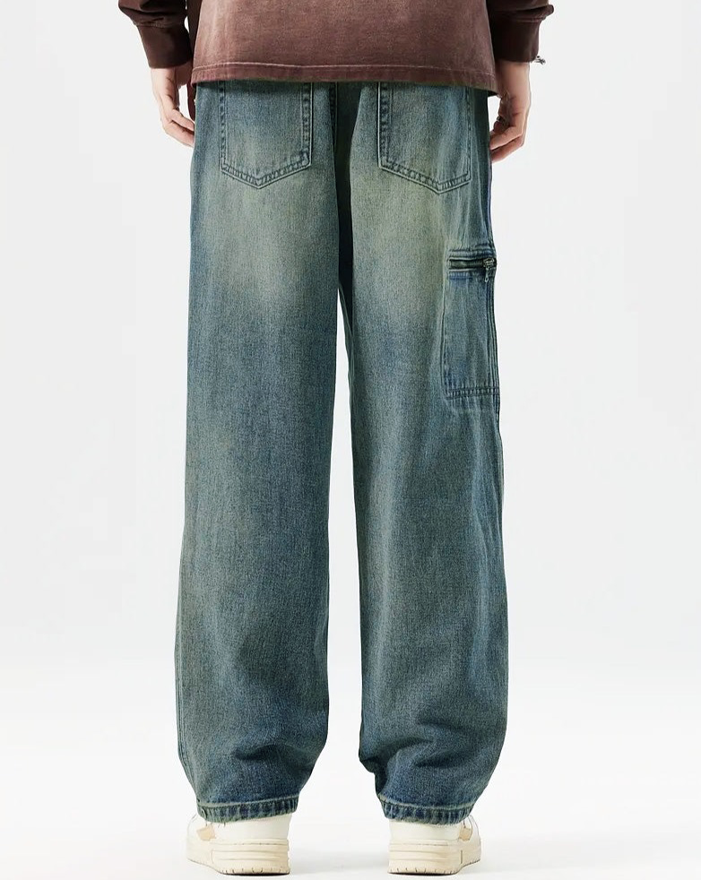 Designed with a relaxed fit and a modern utility pocket, these jeans bring a functional edge to classic denim. Faded and worn-in for everyday ease, they’re built for both movement and attitude.