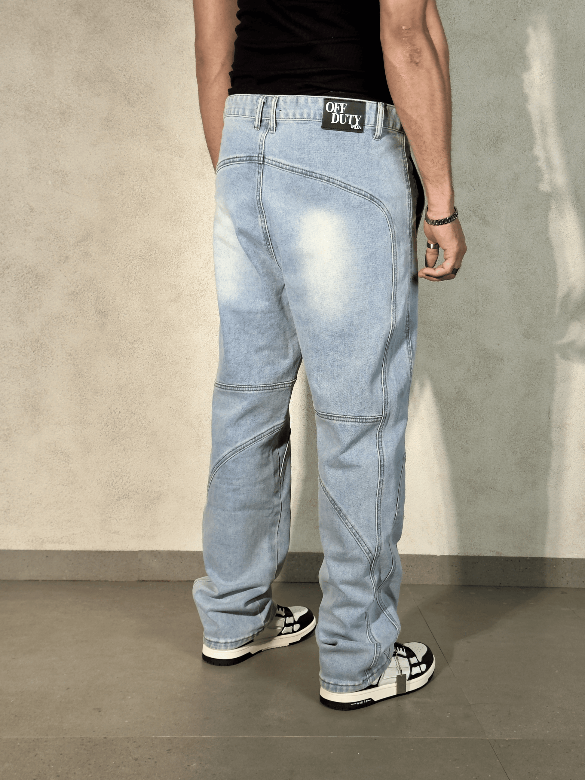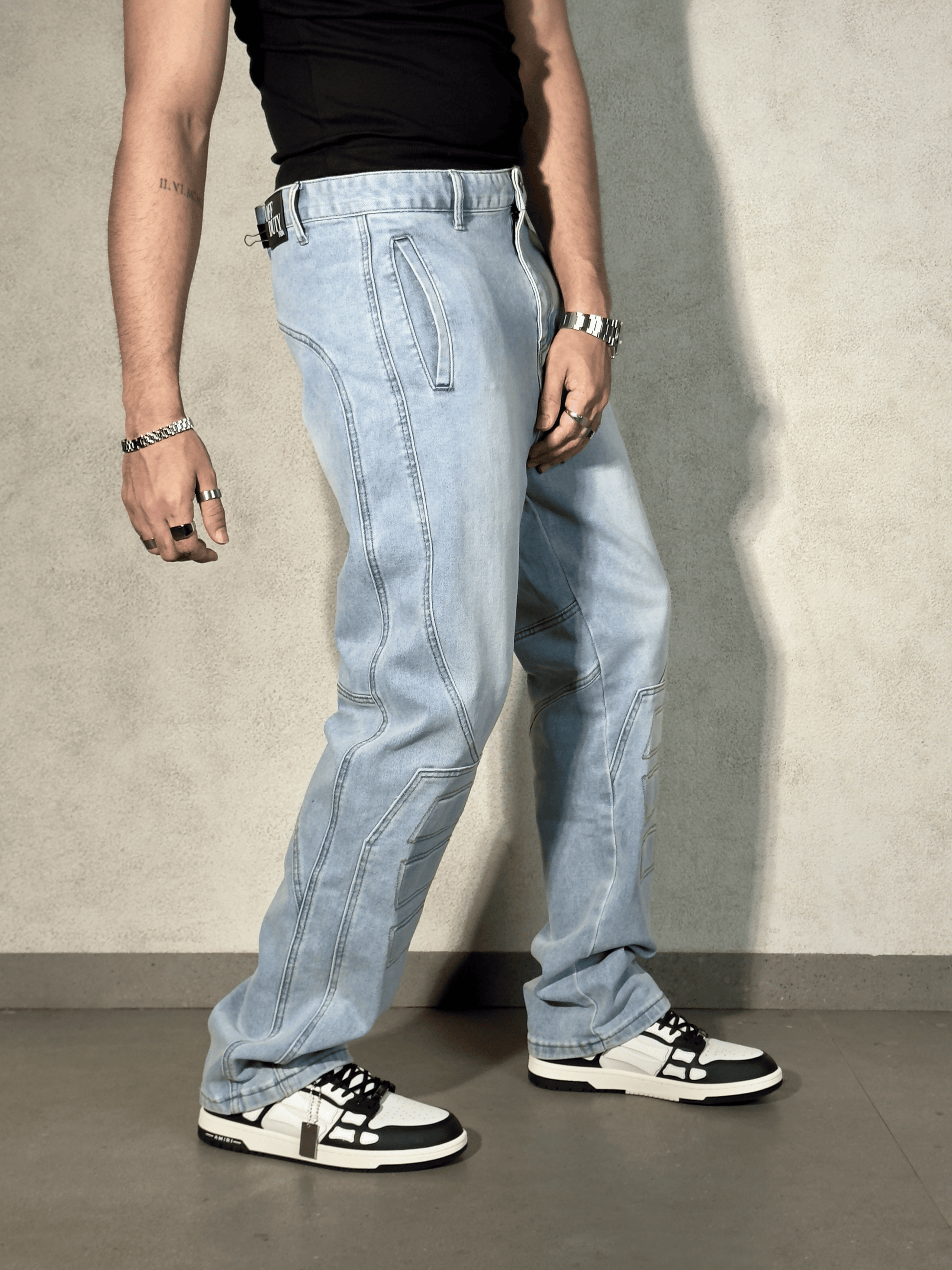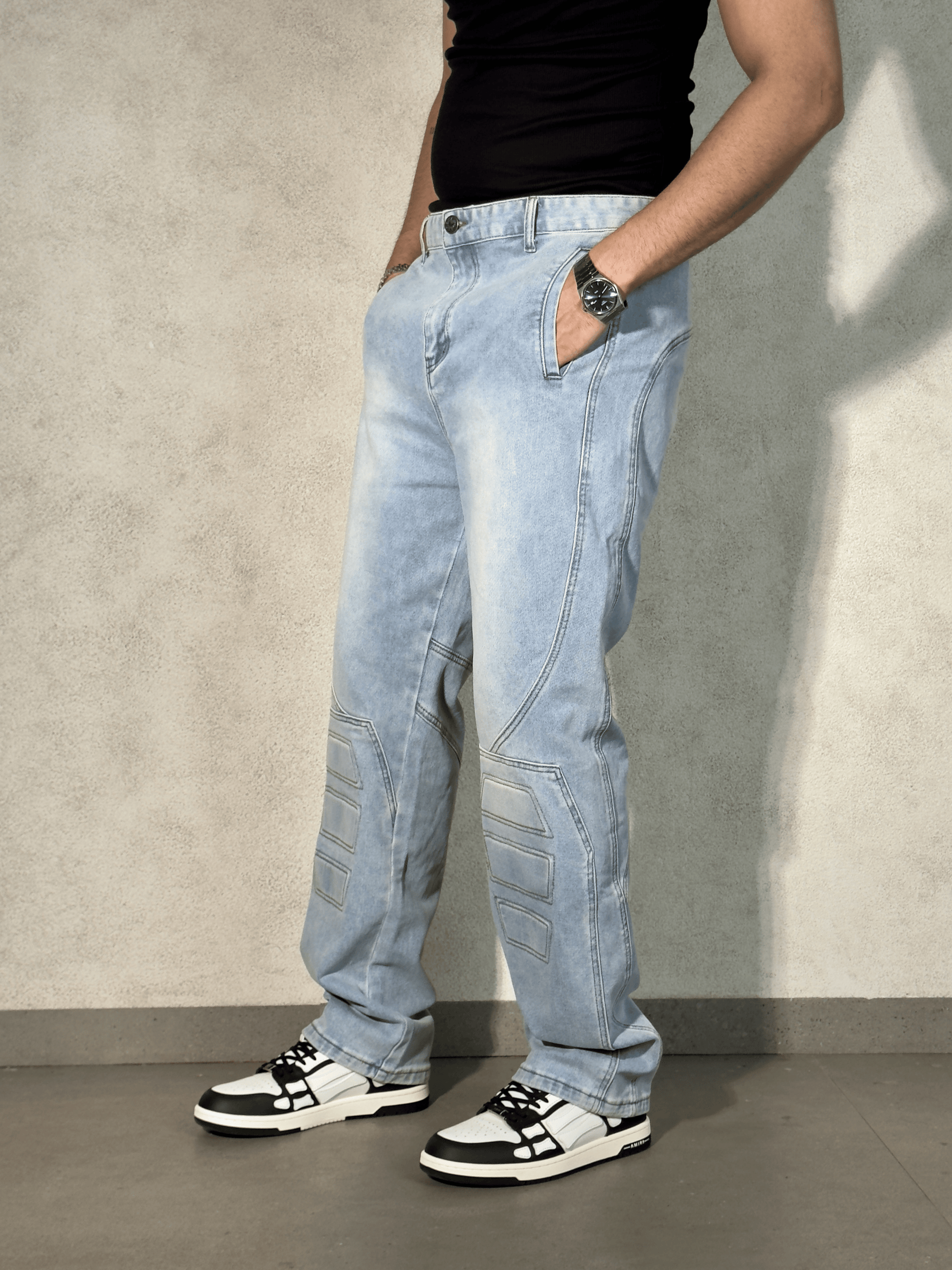 Inspired by moto detailing, these light-wash straight jeans feature bold knee paneling and curved seam lines that add structure and edge. Finished with a faded wash for a lived-in vibe, they balance rugged streetwear attitude with everyday wearability