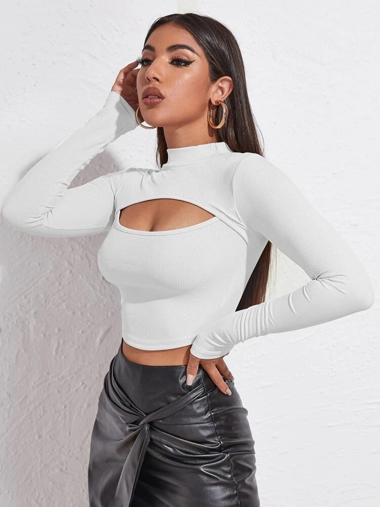 This top is stretchy and soft, features a normal neckline, long sleeves, a cut out detail on the chest and tight fit.
